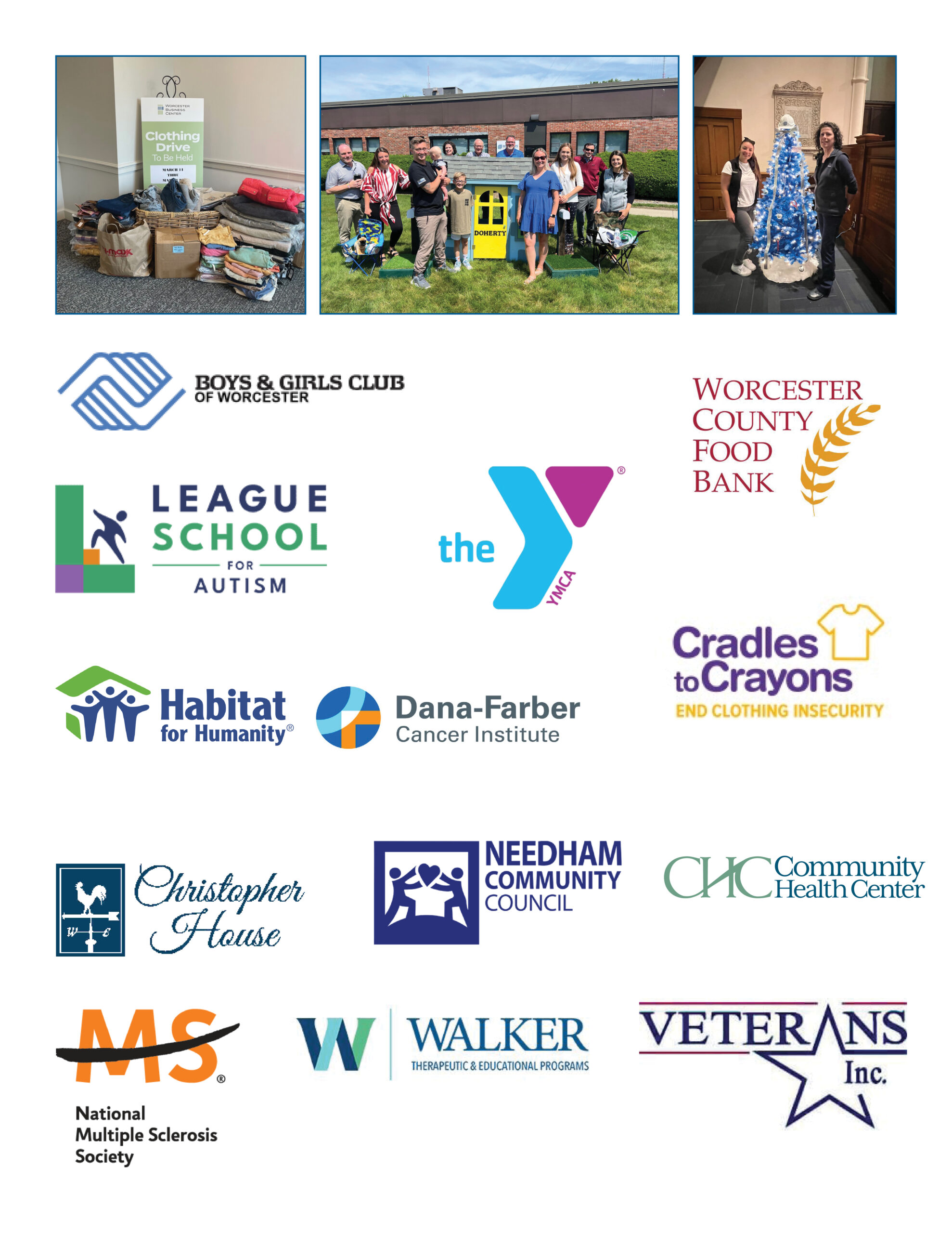 Some of our recent contributions of both time and financial resources have been in support of the Needham Community Council, Worcester County Food Bank, , Habitat for Humanity, Dana Farber, League School, Multiple Sclerosis Society, Boys & Girls Club of Worcester, YMCA of Central MA, Walker Therapeutic & Educational Programs, and many others.